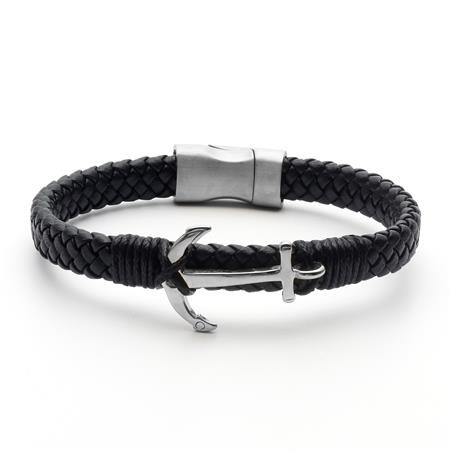 Elegáns bőr karkötő. Fekete fonottbőrből, ezüst színű horgonnyal, mágneszárral. Általános férfi méretben, kb 10 mm széles. Csomagolás: ajándékdobozban,