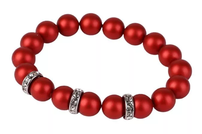 Eredeti Swarovski® gyöngyből készült karkötő, fehér Swarovski® rondella kristályokkal díszítve. A gyöngy piros árnyalatú. Alkalmi ruhához is hordható, elegáns szín. A karkötő könnyen fel- és levehető, mivel rugalmas fűzőszálra van felfűzve. M-es méret, kb. 18,5cm, ami az általános női méret. A csomag tartalmaz fűzőszálat és egy darab tartalék gyöngyöt. Csomagolás: díszdobozban.