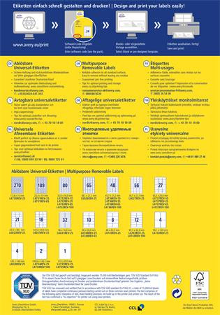 Pontos adagolás és garantáltan elakadásmentes nyomtatás az innovatív ultragrip® technológiának köszönhetően -öntapadó -visszaszedhetó -méret: 96x50,8 mm -megbízható tapadás -ragasztómaradvány nélkül eltávolítható -TÜV SÜD által bevizsgált és tanúsított problémamentes nyomtatás a lézernyomtatók esetén -tökéletes címkézést, tűéles képeket, tökéletes toner tapadást és elkenődésmentes felületet garantál -környezetbarát, FSC® minősített és klórmentes eljárással fehérített -tervezze meg és nyomtassa ki címkéit gyorsan és egyszerűen - ingyenes szoftverünkért és sablonjainkért látogasson el a www.avery.hu/szoftver weboldalra vagy használja a Microsoft® Office csomagokba beépített sablonjainkat -optimalizált minőség tintasugaras, lézer és színes lézer nyomtatókhoz, fénymásolókhoz Gyártó/első EU forgalmazó elérhetősége: Best Label Kft. 8184 Balatonfűzfő hrsz.: 1498/321. info@bestlabel.hu www.bestlabel.hu